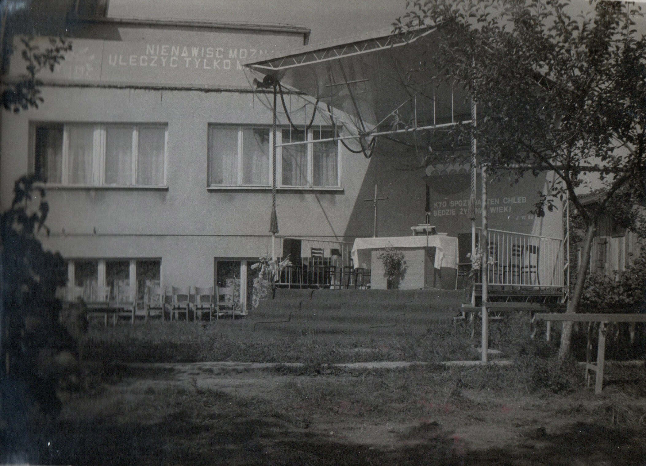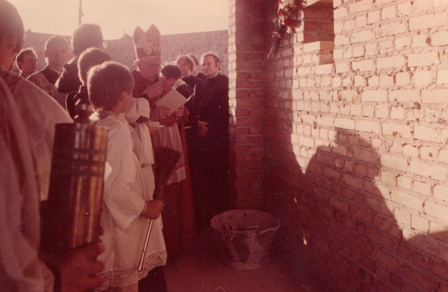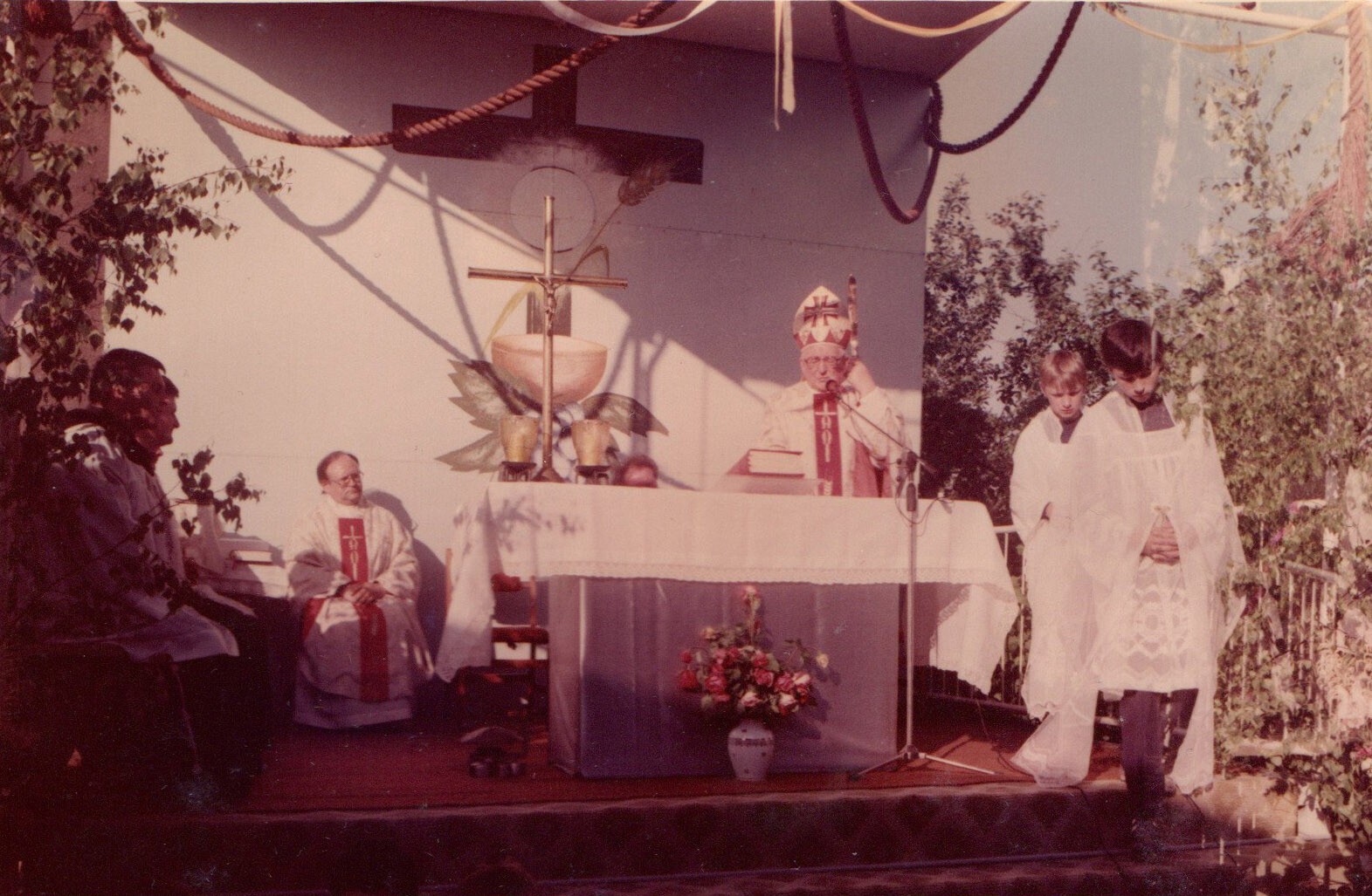 | 06.1982 | OŁTARZ POLOWYPonieważ używana dotychczas kaplica przestała mieścić wiernych gromadzących się na liturgii, za zgodą władz zakonnych na placu przed punktem katechetycznym zbudowany został ołtarz polowy. | ![]() | |