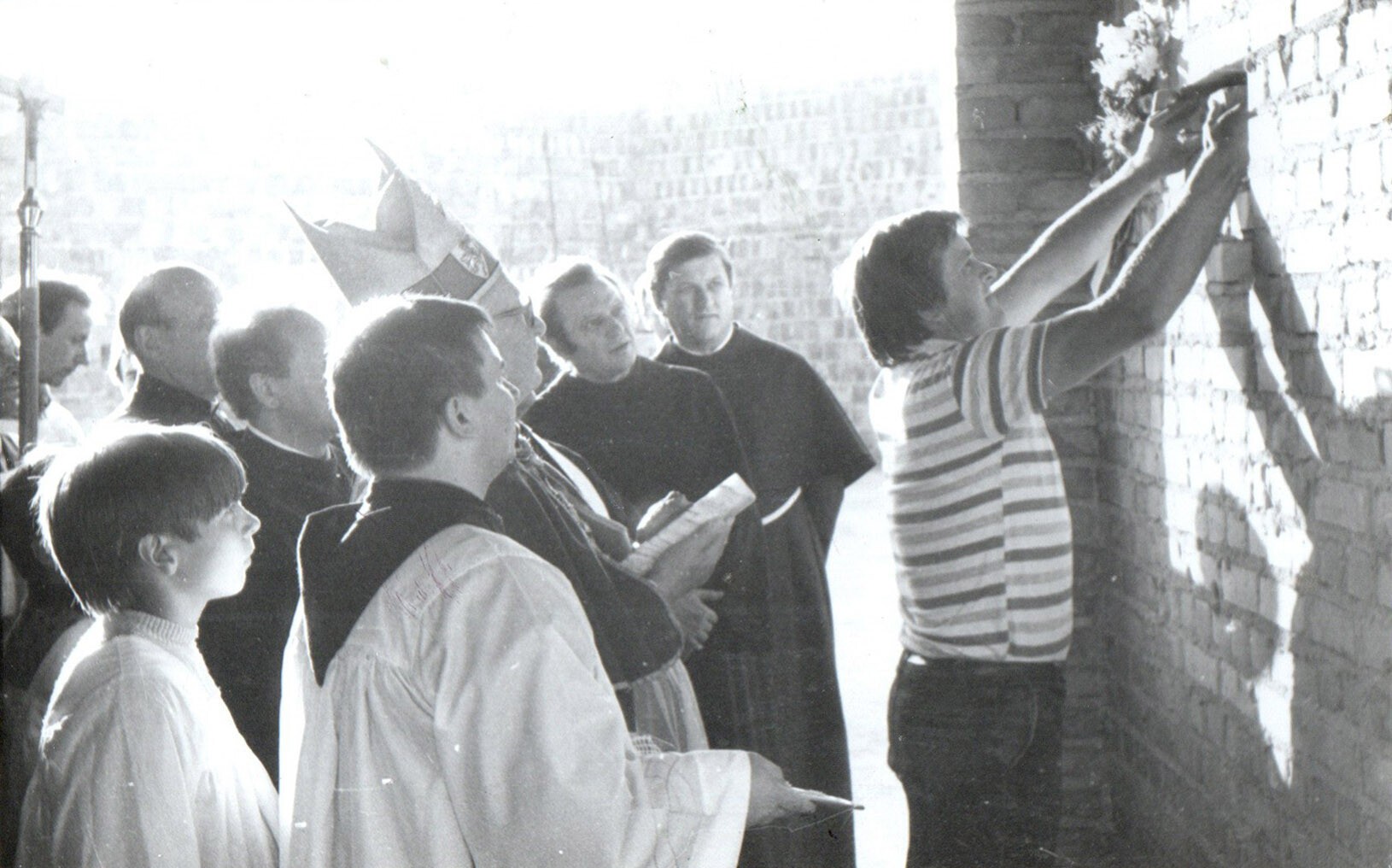 | 24.06.1989 | POŚWIĘCENIE KAMIENIA WĘGIELNEGOPodczas wieczornej Eucharystii biskup Ignacy Jeż poświęcił kamień węgielny pod budowę kościoła. Po liturgii kamień został procesyjnie przeniesiony na plac budowy i wmurowany w ścianę przedsionka, gdzie można go oglądać do chwili obecnej. | ![]() | |